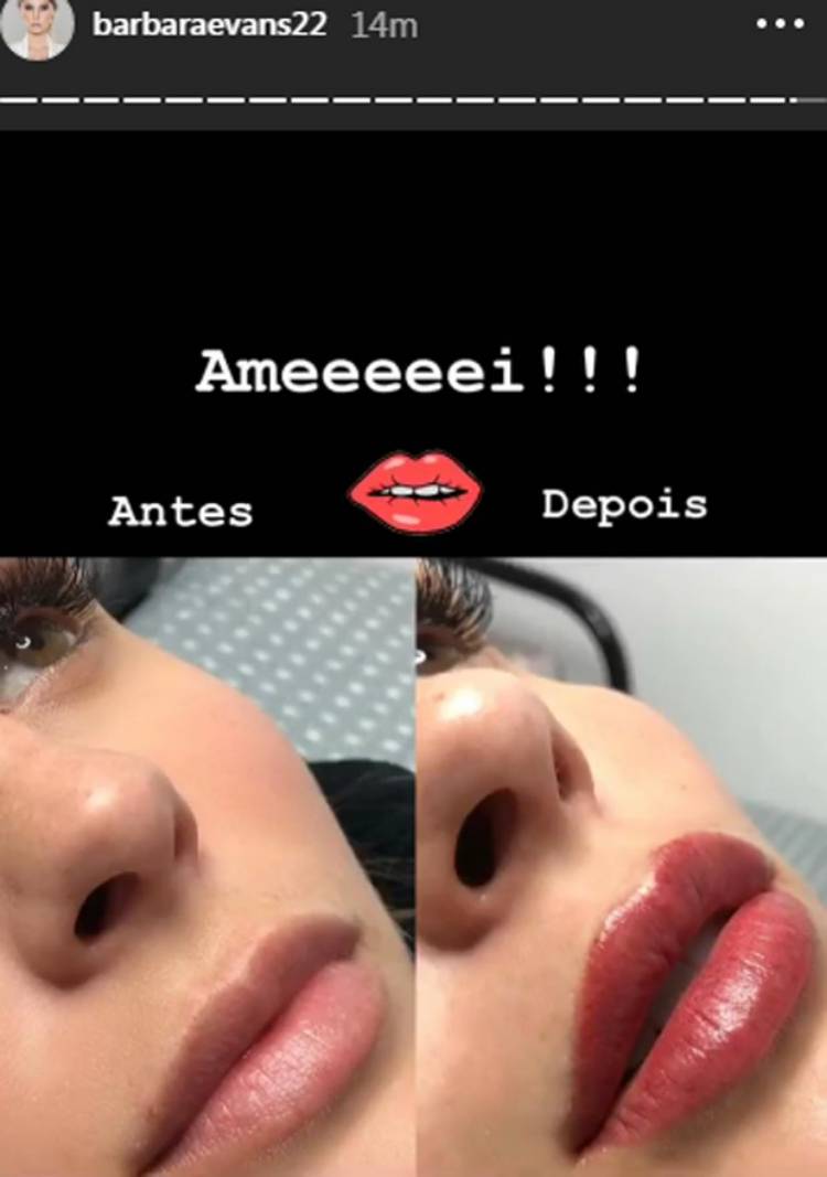 Algum tempo depois, Bárbara postou um comparativo do antes e do depois, deixando claro que estava satisfeita com o efeito final, que deixou sua boca com um tom de rosa vivo. O procedimento foi feito por Sabrina Lasfir.
