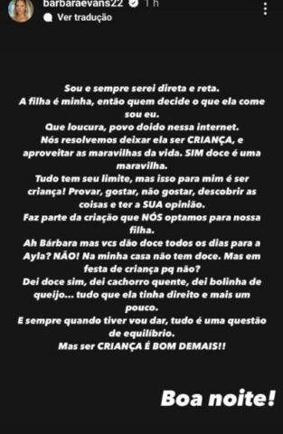 E seguiu: “Tudo tem seu limite, mas isso para mim é ser criança! Provar, gostar, não gostar, descobrir as coisas e ter a sua opinião. Faz parte da criação que nós optamos para nossa filha. ‘Ah Bárbara, mas vocês dão doce todos os dias para a Ayla?’ Não! Na minha casa não tem doce“, contou.