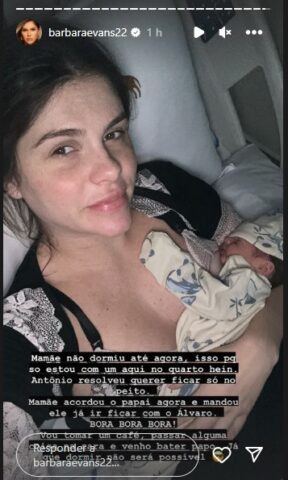 Dessa forma, por meio dos stories no Instagram, Bárbara Evans relatou: “Mamãe não dormiu até agora, isso porque só estou com um aqui no quarto hein. Antonio resolveu querer ficar só no meu peito. Mamãe acordou agora o papai e mandou ele já ir ficar com o Álvaro. Bora! Vou tomar café, passar alguma coisa na cara e venho bater papo, já que dormir não será possível“, disse a mamãe coruja, que segue sem previsão de alta médica.