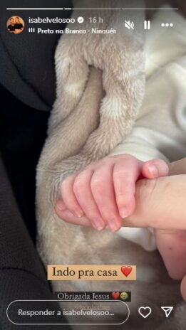 Devido seu parto ter sido prematuro, diante do câncer que a jovem enfrenta desde os 15 anos, Arthur ficou internado na Unidade de Terapia Intensiva (UTI) para ganhar peso. “Indo para casa. Obrigada, Jesus”, escreveu Isabel Veloso em um Story do Instagram.