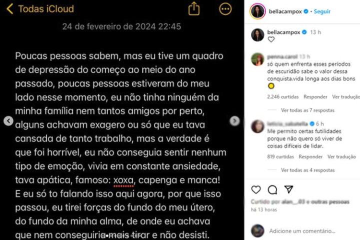 Bella Campos usou seu perfil no Instagram na noite deste sábado (24) para fazer uma revelação sobre sua própria saúde. De acordo com a estrela, ela foi diagnosticada com depressão em 2023 e não falou sobre o assunto para muitas pessoas na época.
