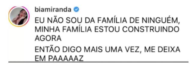 Sendo assim, Bia resolveu se pronunciar sobre o assunto que deu o que falar recentemente. Através de um comentário deixado em uma página do Instagram, ela rebateu: ”Eu não sou da família de ninguém. Minha família estou construindo agora. Então, digo mais uma vez: me deixa em paz”, enfatizou a ex-participante de A Fazenda 14.