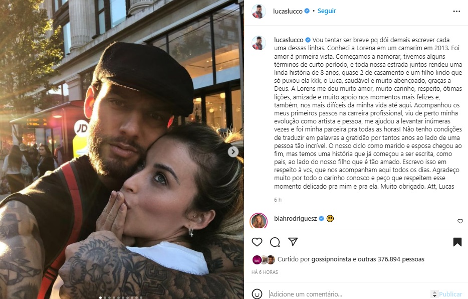 “Vou tentar ser breve pq dói demais escrever cada uma dessas linhas. Conheci a Lorena em um camarim em 2013. Foi amor à primeira vista. Começamos a namorar, tivemos alguns términos de curto período, e toda nossa estrada juntos rendeu uma linda história de 8 anos, quase 2 de casamento e um filho lindo que só puxou ela kkk, o Luca, saudável e muito abençoado, graças a Deus. A Lorens me deu muito amor, muito carinho, respeito, ótimas lições, amizade e muito apoio nos momentos mais felizes e, também, nos mais difíceis da minha vida até aqui”, escreveu Lucas Lucco.