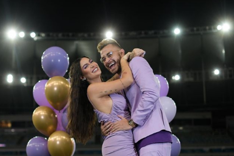 Através de seu Instagram ela compartilhou uma foto em que aparece ao lado do amado, e com balões nas cores dourado e lilás, as mesmas das roupas dos apaixonados.