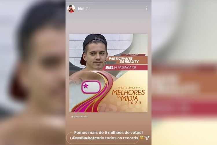 Feliz da vida com o feito, Biel fez questão de compartilhar a sua vitória aos seus milhões de seguidores. E, através da ferramenta stories de seu perfil oficial no Instagram, o artista celebrou e parabenizou os fãs por mais um recorde batido: “Foram mais de 5 milhões de votos. Família batendo todos os records”.