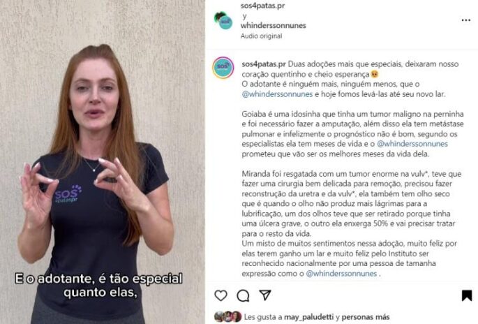 “Um misto de muitos sentimentos nessa adoção, muito feliz por elas terem ganho um lar e muito feliz pelo Instituto ser reconhecido nacionalmente por uma pessoa de tamanha expressão como o @whinderssonnunes”, finalizaram.