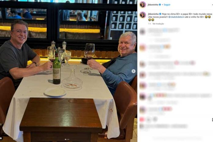 José Bonifácio de Oliveira Sobrinho, o Boni, apareceu ao lado do filho, Boninho, durante jantar nesta terça-feira (29). O diretor dividiu registros do momento em seu perfil oficial no Instagram.