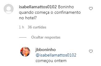 Nos comentários de uma postagem sobre o ‘The Voice’ no perfil do diretor, ela perguntou quando começaria o confinamento dos participantes. Boninho logo respondeu. “Começou ontem (domingo, 3).