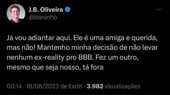 No entanto, para encerrar o assunto, o diretor explicou em seu Twitter: “Já vou adiantar aqui. Ela [Carol] é uma amiga e uma querida, mas não! Mantenho a minha decisão de não levar nenhum ex-reality pro BBB. Fez um outro, mesmo que seja nosso, tá fora”, declarou ele, negando que esteja em seus planos chamar ex-realitys para a atração que estreia em janeiro.
