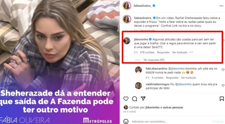 Dessa forma, por meio de uma publicação feita pela nossa colega Fábia Oliveira no Instagram, aonde ela publicou, ‘Sheherazade dá a entender que saída de A Fazenda pode ter outro motivo‘, Boninho logo fez questão de reagir a polêmica e, de cara, opinou: “Algumas atitudes são usadas para sair sem ter que jogar a toalha. Usar a regra para eliminar e sair sem pedir é uma delas! Será???“, comentou ele.