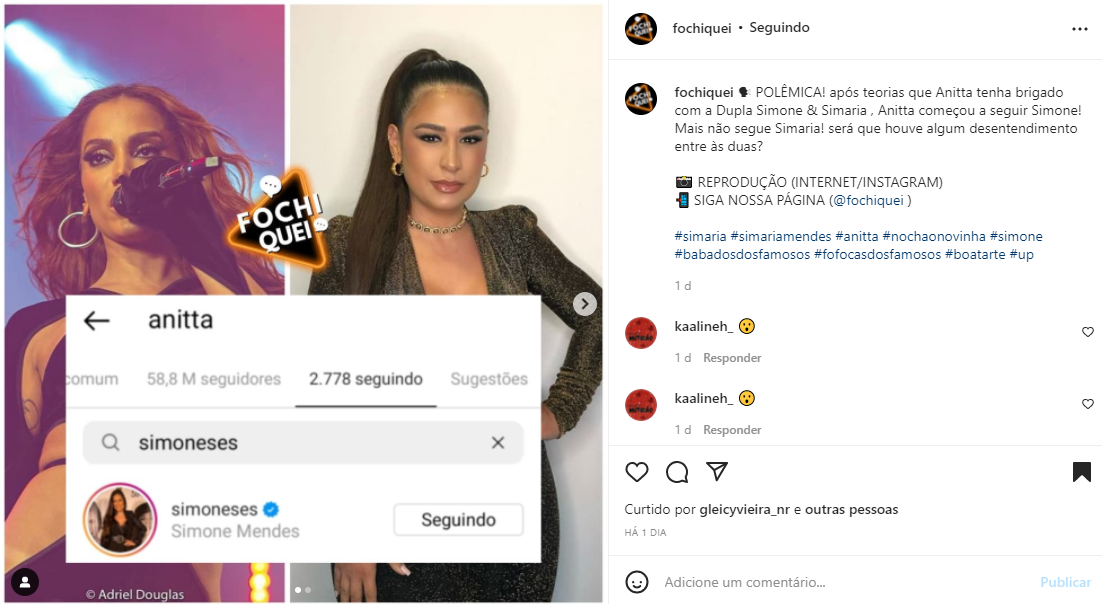 A página fochiquei foi uma das primeiras a compartilhar algumas teorias sobre essa briga. Desse modo, disparou: “POLÊMICA! Após teorias que Anitta tenha brigado com a Dupla Simone & Simaria, Anitta começou a seguir Simone! Mais não segue Simaria! Será que houve algum desentendimento entre às duas?”.
