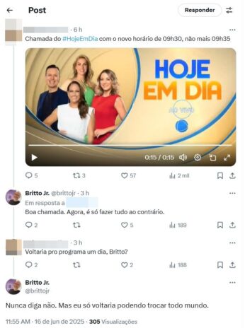 Tudo começou quando Britto notou a nova chamada do ‘HED’, realizou um comentário demonstrando que tinha achado boa e a pessoa resolveu fazer o questionamento a ele: “Voltaria para o programa um dia, Britto?”, indagou o internauta, no X, antigo Twitter.