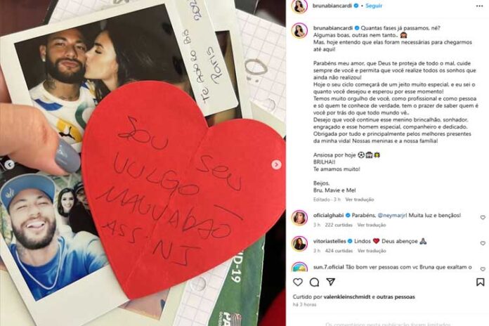 Bruna Biancardi se declarou ao amado, o agradecendo por estar ao seu lado e por ter lhe dado uma família. Bruna e Neymar são pais de Mavie e estão à espera de outra menina. A influenciadora completou a mensagem dizendo que está ansiosa pelo retorno de Neymar aos campos, após o jogador passar um tempo longe dos gramados devido a uma lesão.