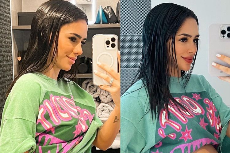 Neste sábado (30), Bruna Biancardi, de 29 anos, que espera Mavie, sua primeira filha com Neymar, de 31 anos, publicou uma comparação da barriga de gravidez com um antes e depois. A montagem de imagens foi postada por ela nas redes sociais.