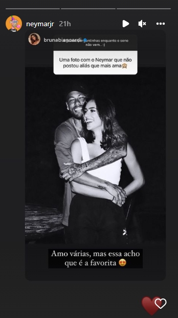 “Uma foto com Neymar que não postou, aliás que mais ama”, pediu um fã, na caixinha de perguntas do Instagram. “Amo várias, mais essa acho que é a favorita”, respondeu ela, ao mostrar o registro com o jogador e namorado Neymar. Por sinal, o craque do PSG repostou a foto e adicionou um coração vermelho.