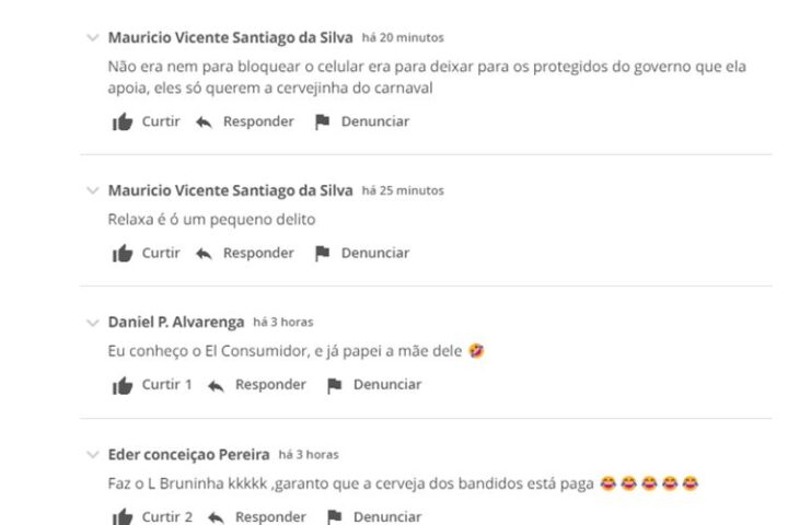 Após o assalto de Bruna se tornar público, alguns internautas chegaram a digitar no X (antigo Twitter): “Não era nem para bloquear o celular era para deixar para os protegidos do governo que ela apoia, eles só querem a cervejinha do carnaval“, disparou um. “Relaxa é só um pequeno delito“, disparou outro. “Faz o L Bruninha kkkkk, garanto que a cerveja dos bandidos está paga“, comentou mais um.
