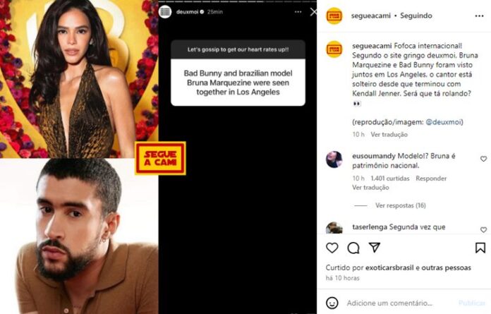 De acordo com informações divulgadas pela página de fofocas internacional, ‘Deuxmoi’, Bruna e Bad Bunny teriam sido vistos juntos, gerando especulações sobre um possível affair entre eles. A informação veio à tona através de uma mensagem anônima publicada pela página: “Bad Bunny e a modelo brasileira Bruna Marquezine foram vistos juntos em Los Angeles“, publicaram, sem fornecer mais detalhes sobre o assunto.