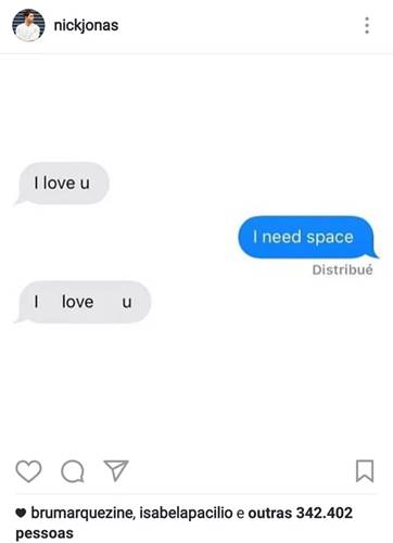 “Quando espaço é apenas uma palavra inventada por alguém que tem medo de tê-lo também”, escreveu ele na legenda de uma imagem de uma conversa num chat em que uma pessoa fala “Eu te amo” e a outra responde que precisa de espaço, recebendo a frase “Eu te amo” novamente, mas com as palavras escritas entre maiores espaços.