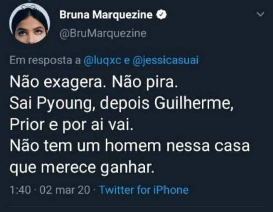 “Sai Pyong, depois Guilherme, Prior e por aí vai. Não tem um homem nessa casa que merece ganhar”, escreveu Bruna, ao responder um internauta. Um pouco depois a atriz acabou apagando a publicação.