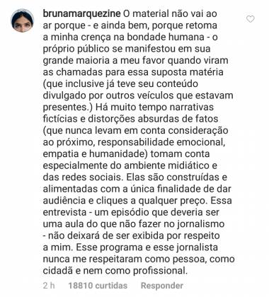 Marquezine não perdeu tempo e o rebateu: “O material não vai ar porque – e ainda bem, porque retoma a minha crença na bondade humana – o público se manifestou em sua grande maioria a meu favor quando viram as chamadas para essa suposta matéria. Há muito tempo narrativas fictícias e distorções absurdas de fatos (que nunca levam em conta consideração ao próximo, responsabilidade emocional, empatia e humanidade) tomam conta especialmente do ambiente midiático e das redes sociais. Elas são construídas e alimentadas com a única finalidade de dar audiência e cliques a qualquer preço. (…) Esse programa e esse jornalista nunca me respeitaram como pessoa, como cidadã e nem como profissional”, disse.