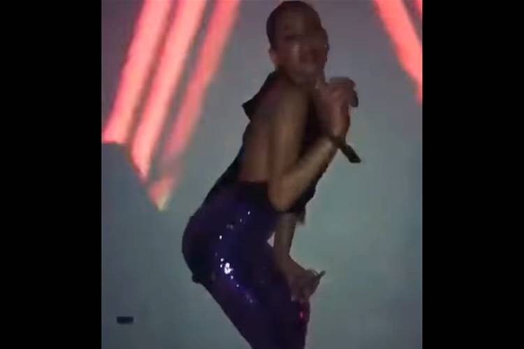 No vídeo, a ex-namorada de Neymar está usando uma blusa preta decotada nas costas e uma calça de paetê roxa.