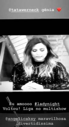 Além disso, ela também elogiou a convidada da atração, Angélica, chamando a loira de “Maravilhosa”. A atração de Tatá Werneck, estreou na última segunda-feira (12), e já é sucesso na web. No próximo ano, de acordo com informações, a atração passará a ser exibida pela TV Globo.