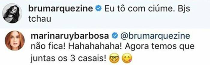 “Eu tô com ciúme. Beijos Tchau“, escreveu Marquezine. “Não fica! hahah! Agora temos que juntar os 3 casais!“, escreveu Marina.