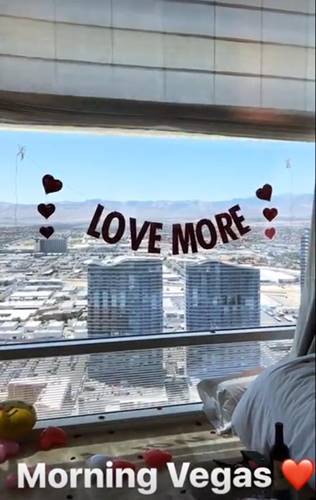 Na janela, as palavras “Ame mais” (Love More, em inglês), deram o tom romântico, além de muitos corações em balões e um vinho no chão do quarto.