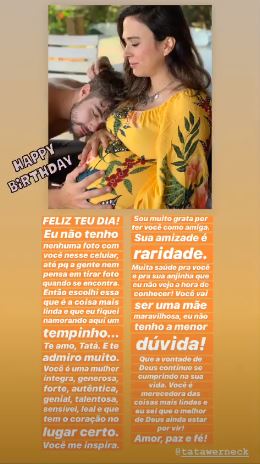 “Te amo, Tatá. E te admiro muito. Você é uma mulher íntegra, generosa, forte, autêntica, genial, talentosa, sensível, leal e que tem um coração no lugar certo. Você me inspira”, declarou ela.
