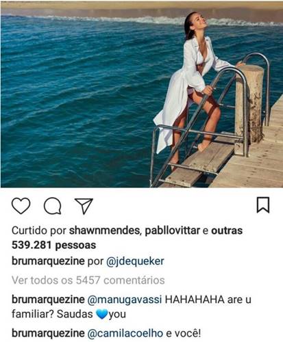 Bruna Marquezine está fazendo sucesso entre os artistas internacionais! Depois de Nick Jonas, a atriz recebeu uma curtida do cantor canadense, Shawn Mendes. O astro deu um like em um registro que a brasileira aparece deslumbrante de biquíni branco.