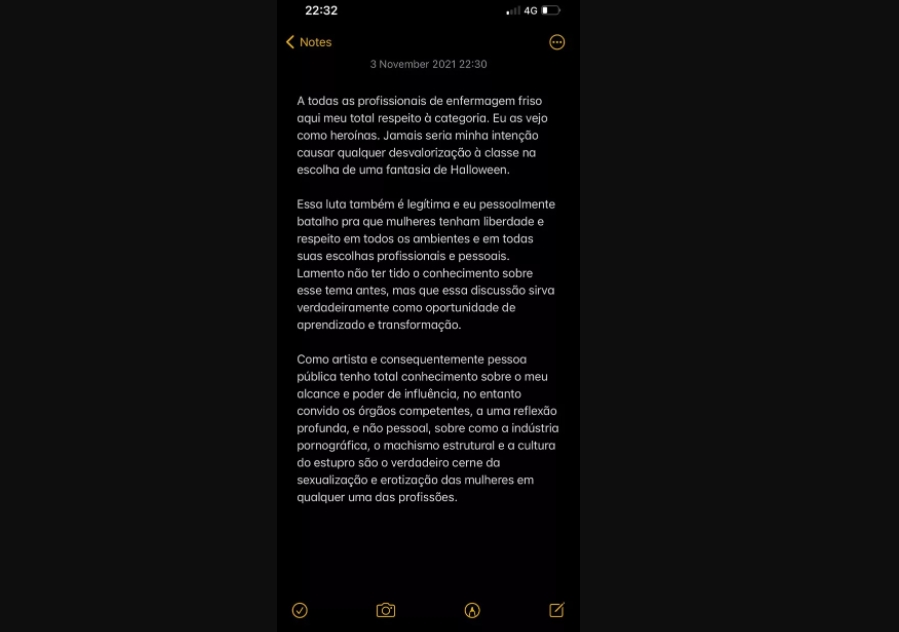 Sendo assim, a atriz ainda comentou que respeita à categoria de enfermeiras no país, e reconhece que elas são mais que profissionais, são heroínas. “A todas as profissionais de enfermagem friso aqui meu total respeito à categoria. Eu as vejo como heroínas. Jamais seria minha intenção causar qualquer desvalorização à classe na escolha de uma fantasia de Halloween.”