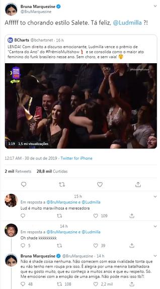 Com os prêmios em mãos, Lud foi muito parabenizada na web e uma delas foi a atriz Bruna Marquezine que usou o seu Twitter para homenagear a cantora.