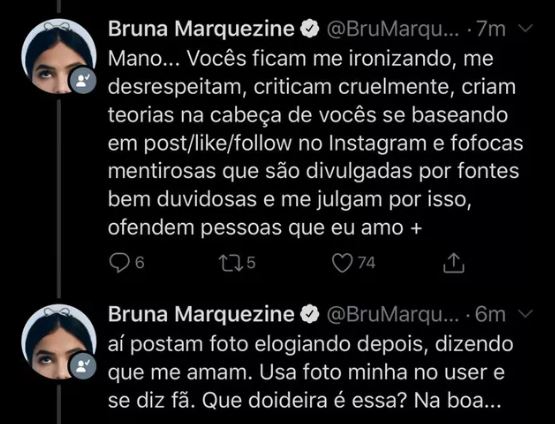 Irritada com as mensagens de cobrança e com o desrespeito, Bruna rebateu os comentários de vários seguidores. “Mano… Vocês ficam me ironizando, me desrespeitam, criticam cruelmente, criam teorias na cabeça de vocês se baseando em post/like/follow no Instagram e fofocas mentirosas que são divulgadas por fontes bem duvidosas e me julgam por isso, ofendem pessoas que eu amo mais. Aí postam foto elogiando depois, dizendo que me amam. Usa foto minha no user e se diz fã. Que doideira é essa? Na boa…”, disparou.