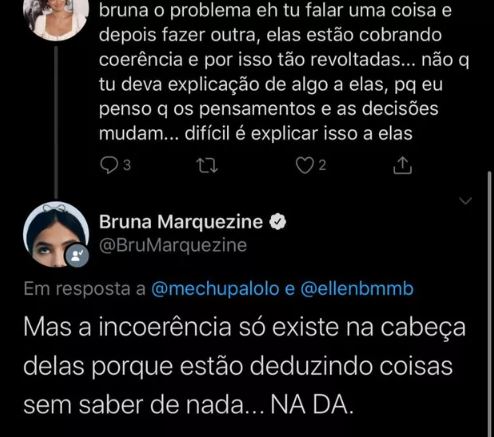 Uma internauta tentou explicar o ponto de vista dos fãs. “Bruna, o problema é tu falar uma coisa e depois fazer outra, elas estão cobrando coerência e por isso tão revoltadas… não que tu deva explicação de algo a elas, porque eu penso que os pensamentos e as decisões mudam… difícil é explicar isso a elas”. E ela rebateu. “Mas a incoerência só existe na cabeça delas porque estão deduzindo coisas sem saber de nada… NA-DA”.