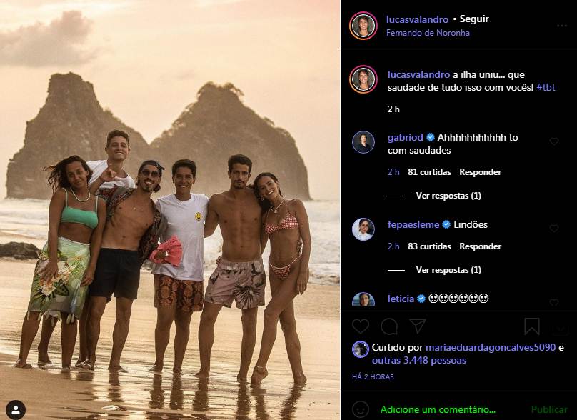 Caiu na rede já era. Bruna Marquezine e Enzo Celulari até tentam ser discretos no romance, mas não tem como esconder nada por muito tempo em tempos de redes sociais. Nesta quinta-feira, dia de tbt, o influencer Lucas Valandro publicou uma lembrança da viagem a Fernando de Noronha em seu perfil no Instagram e adivinha quem tava nela? A atriz e o filho de Edson Celulari e Claudia Raia.
