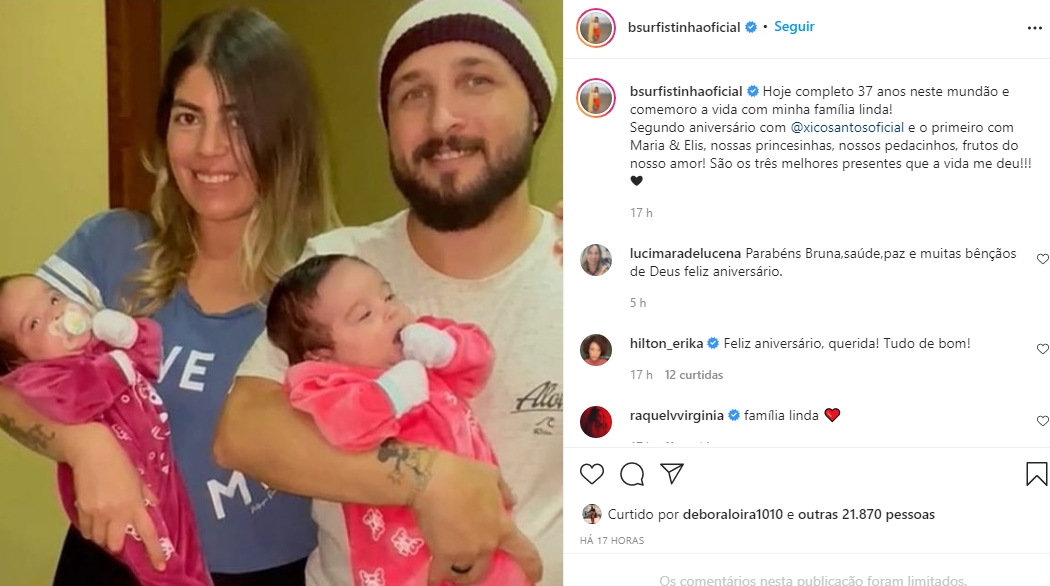 “Hoje completo 37 anos neste mundão e comemoro a vida com minha família linda! Segundo aniversário com Xico Santos e o primeiro com Maria & Elis, nossas princesinhas, nossos pedacinhos, frutos do nosso amor! São os três melhores presentes que a vida me deu!“, se derreteu.