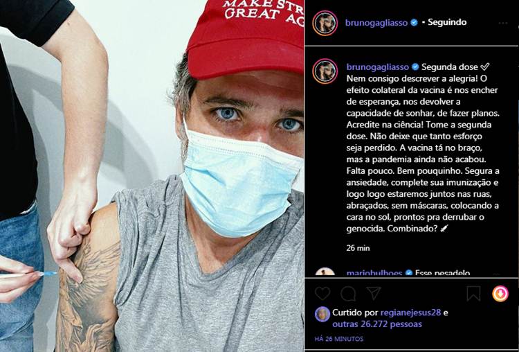 Em seu perfil no Instagram, Bruno publico um registro do momento da imunização. “Segunda dose! Nem consigo descrever a alegria! O efeito colateral da vacina é nos encher de esperança, nos devolver a capacidade de sonhar, de fazer planos”, disse.