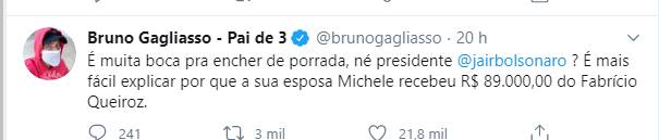 Em um post anterior, o artista já havia alfinetado Bolsonaro. “Presidente @jairbolsonaro, por que sua esposa, Michelle, recebeu 89 mil de Fabrício Queiro.”