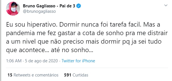 “Eu sou hiperativo. Dormir nunca foi tarefa fácil. Mas a pandemia me fez gastar a cota de sonho pra me distrair a um nível que não preciso mais dormir porque já sei tudo que acontece… até no sonho…”, escreveu ele.