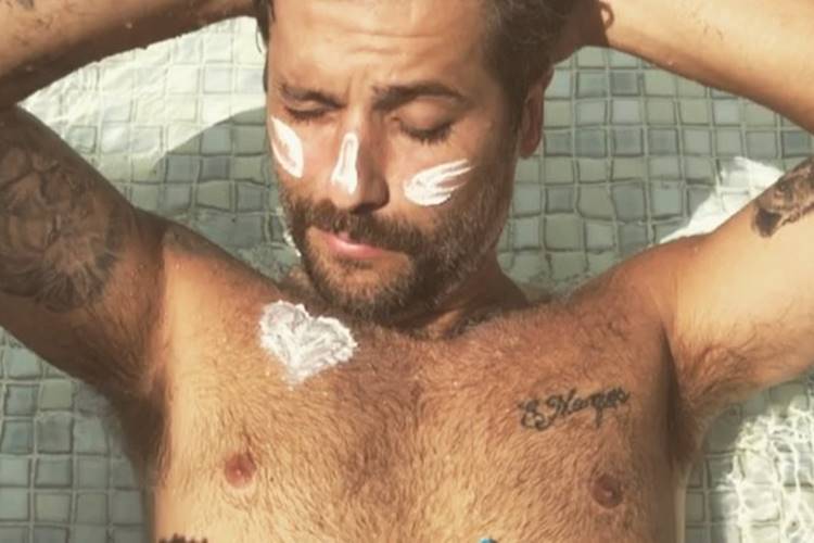 No registro estilo boomerang, o marido de Giovanna Ewbank surge recebendo a ajuda da herdeira para passar o protetor solar, enquanto curte o clima quente do arquipélago pernambucano.
