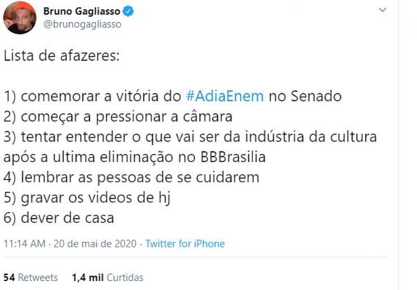 “Lista de afazeres: 1) comemorar a vitória do #AdiaEnem no Senado 2) começar a pressionar a câmara 3) tentar entender o que vai ser da indústria da cultura após a ultima eliminação no BBBrasilia 4) lembrar as pessoas de se cuidarem 5) gravar os videos de hoje 6) dever de casa”, escreveu ele em um post.