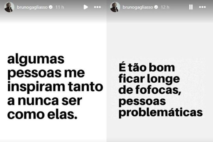 “Algumas pessoas me inspiram tanto a nunca ser como elas“, escreveu Bruno em uma das publicações. Depois, o ator completou: “É tão bom ficar longe de fofocas, pessoas problemáticas“, disse ele, sem citar nomes.