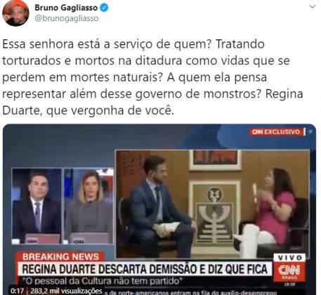 Bruno Gagliasso utilizou as redes sociais para falar sobre a entrevista que sua colega de profissão, a atriz e agora Ministra da Cultura Regina Duarte concedeu ao canal de TV fechado CNN nesta quinta-feira (7).