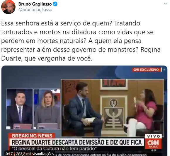 Um deles foi o ator Bruno Gagliasso, que se sentiu como ele próprio disse, revoltado com o que assistiu e com as palavras de sua colega. Nas redes sociais ele fez um desabafo sobre a opinião de sua colega Regina Duarte. Em seu Twitter o ator desabafou e disse sentir-se envergonhado com o que ouviu.