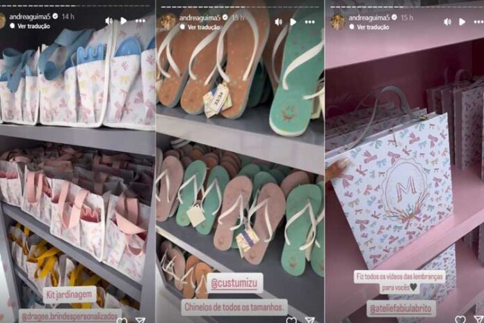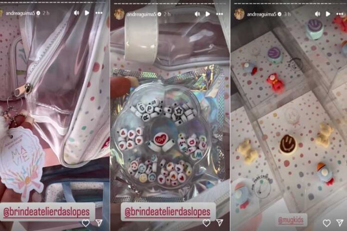 A organizadora do evento, Andrea Guimarães, dividiu em seu Stories no Instagram as lembrancinhas que foram dadas aos convidados durante o aniversário. Itens como chinelos, cadernos para colorir, kits de jardinagem, pulseiras, doces e chinelos estão entre os mimos oferecidos a todos que marcaram presença na festa.