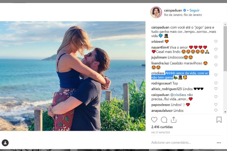 Em seu perfil no Instagram, a apresentadora esportiva da TV Globo, Cris Dias, acabou confirmando em suas rede sociais, que está namorando com o ator Caio Paduan, que até pouco tempo estava namorando com a DJ Djéssica Benfica.