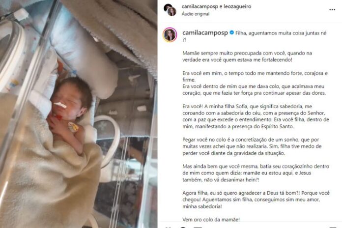 Ao concluir, Camila Campos fez uma agradecimento: “Agora filha, eu só quero agradecer a Deus tá bom?! Porque você chegou! Aguentamos sim filha, conseguimos sim meu amor, minha sabedoria! Vem pro colo da mamãe!”, finalizou Camila Campos.