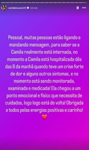 A equipe de Camila iniciou o comunicado contando que muitas pessoas estavam mandando mensagem para o perfil dela e por conta disso eles resolveram se pronunciar sobre o assunto, que é o estado de saúde dela: “No momento, a Camila está hospitalizada desde às 8h da manhã, quando teve uma crise forte de dor e alguns outros sintomas, e no momento está sendo monitorada, examinada e medicada. Ela chegou num ponto emocional e físico que necessita de cuidados, logo logo está de volta. Obrigada a todos pelas energias positivas e carinho”, diz a nota, divulgada nos stories do Instagram de Camila, como você pode acompanhar abaixo.