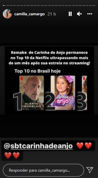 Dessa forma, Camilla Camargo não segurou a emoção ao compartilhar com os fãs o sucesso que a novela ‘Carinha de Anjo’ vem fazendo na Netflix. A atriz destacou que sua alegria é vibrante pelo fato da trama estar entre as 10 mais assistidas no streaming.