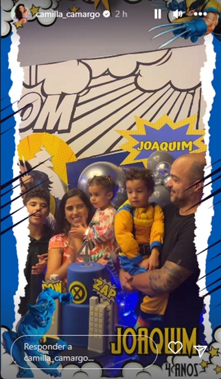 Os avós maternos de Joaquim, Zezé Di Camargo e Zilu Godói, não participaram da comemoração desta quinta-feira, mas a irmã da atriz, Wanessa levou os filhos Osé Marcus e João Francisco. , Luciele Di Camargo, tia de Camilla, também marcou presença ao lado de seus dois filhos, Maria Eduarda e Davi.
